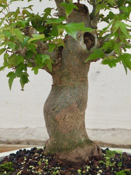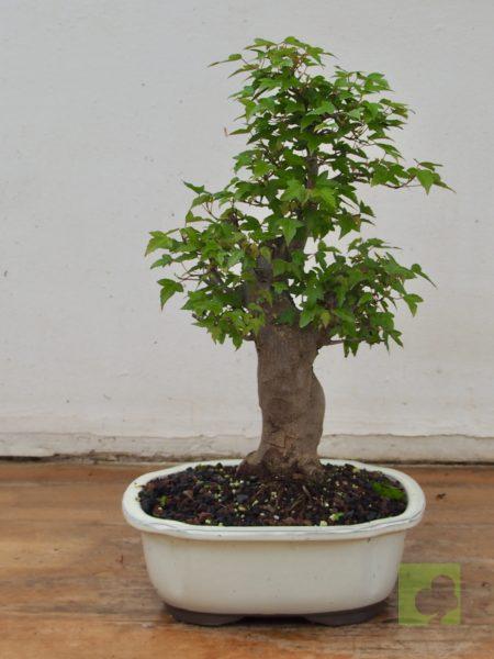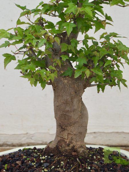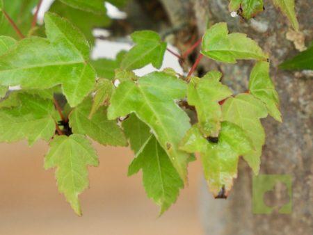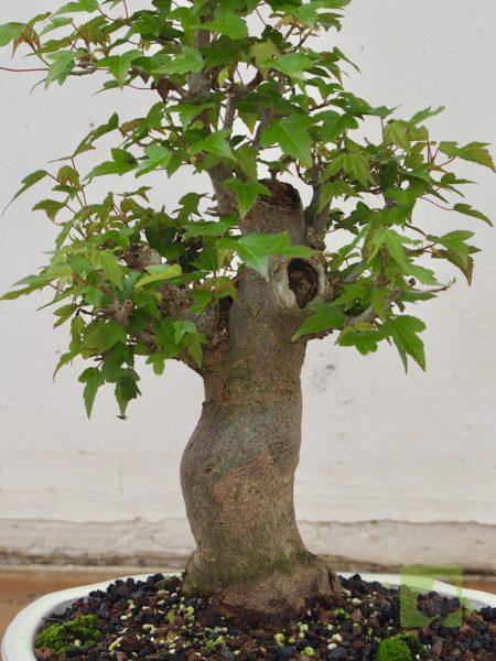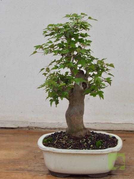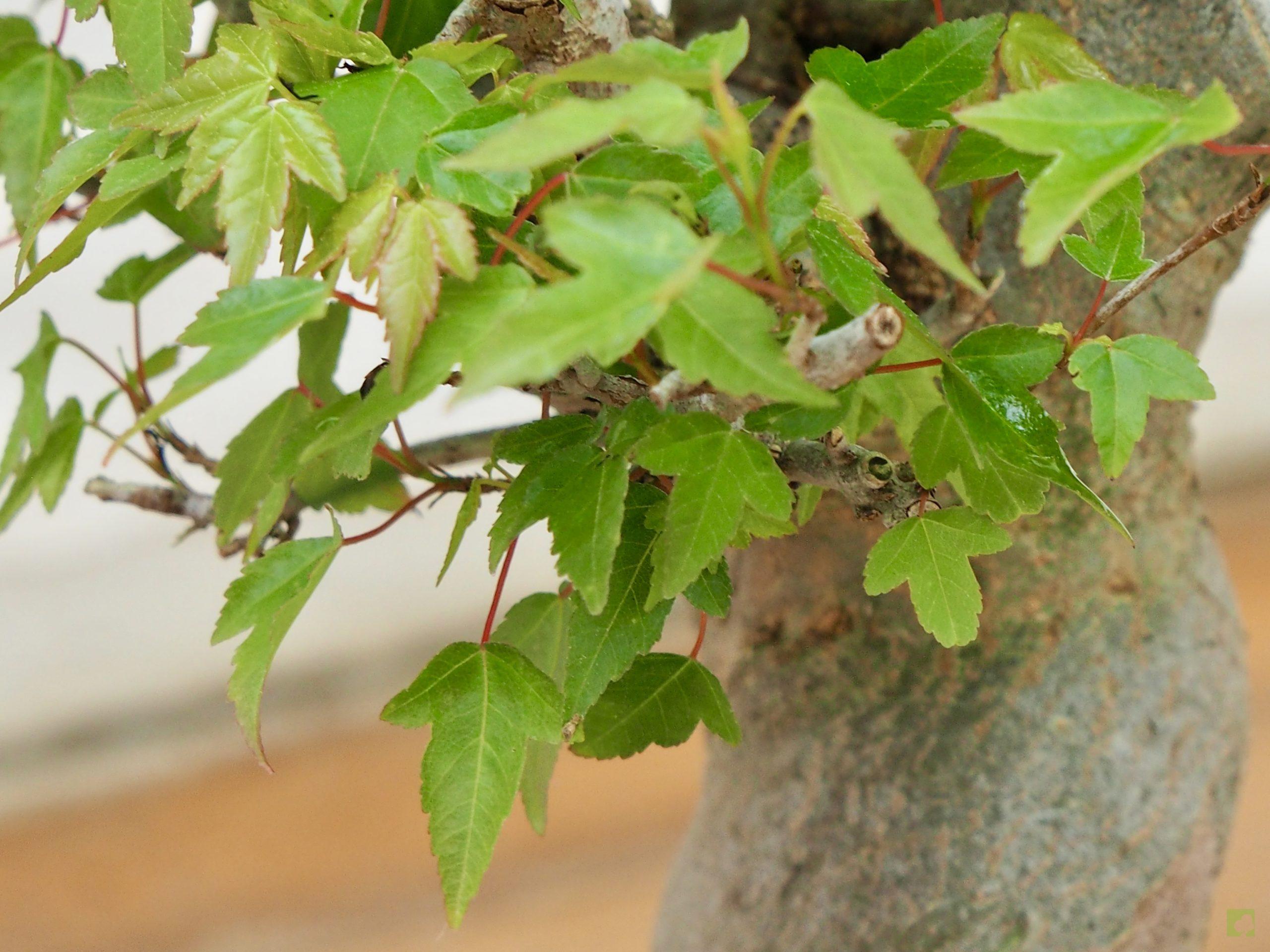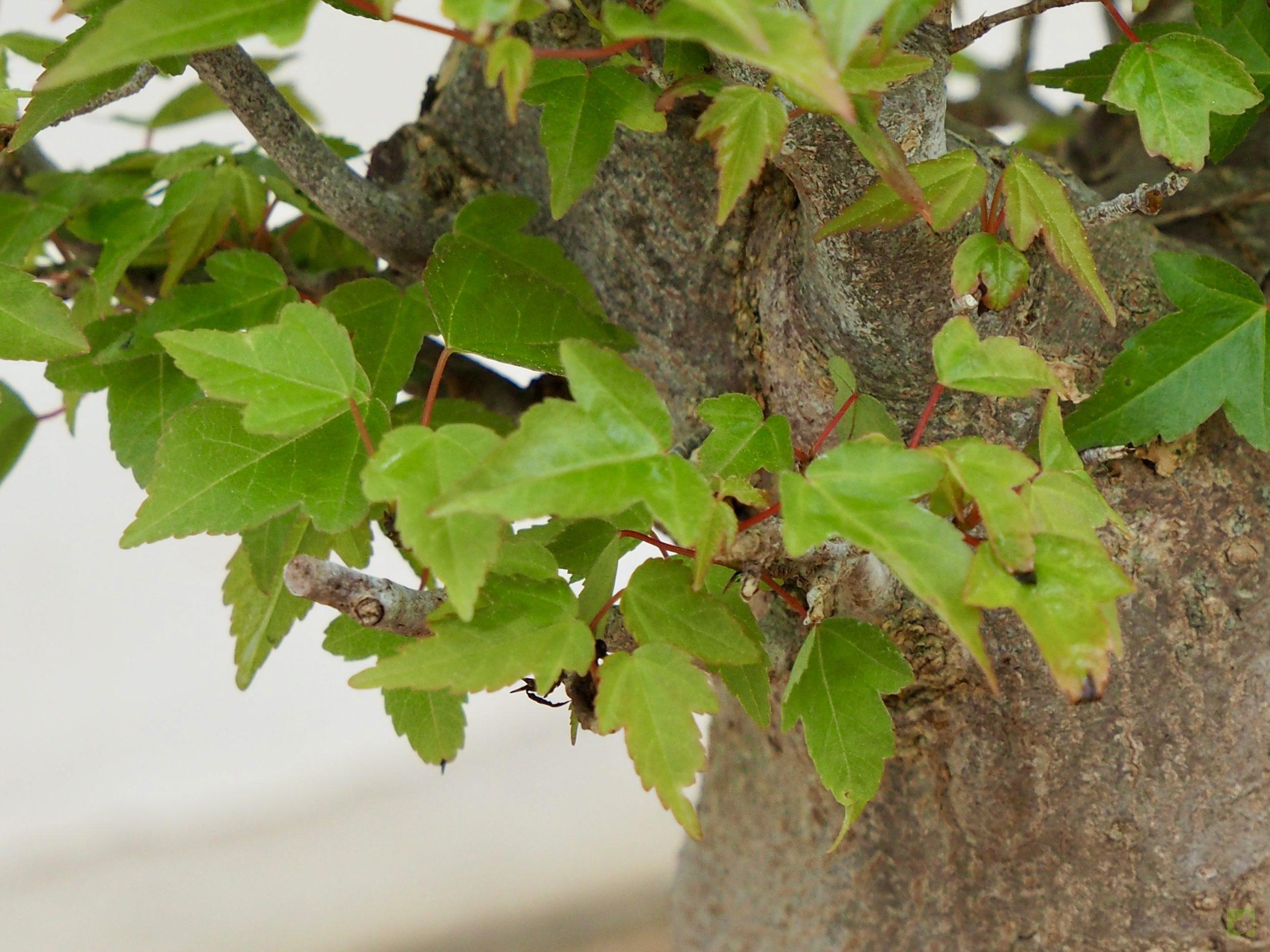 – Poda: Debido a que las yemas son opuestas, los brotes serán dobles y, por tanto, debemos fijarnos en la dirección que nos interesa para la nueva rama y eliminar el brote no deseado. Esta técnica nos permitirá un aumento de ramificación en la dirección elegida. Las ramas, al igual que el tronco, son robustas por lo que siempre debemos eliminar las ramas toscas y gruesas, dejando las más finas. Este es un proceso continuo que debemos repetir estación a estación ya que es el modo de lograr una ramificación fina y delicada. En el segundo año, también en invierno, deben podarse las ramas que nazcan directamente del tronco y afeen la silueta del árbol, utilizando una buena pasta selladora. Crece rápido y obliga a un despunte frecuente, de 2 yemas. Hacer 3 ó 4 despuntes en el transcurso del verano. Esto permite obtener unos arbolitos bien tupidos. Es muy peligroso para la vida del arce podar ramas gruesas fuera del invierno. En verano puede realizarse el defoliado total o parcial sin demasiados problemas, siempre que no se lleve a cabo demasiado tarde dentro de la estación. Por otra parte, es necesario, al principio, dejar que las ramas bajas crezcan libremente para que así engorden y lograr un crecimiento adecuado de esta zona baja.
