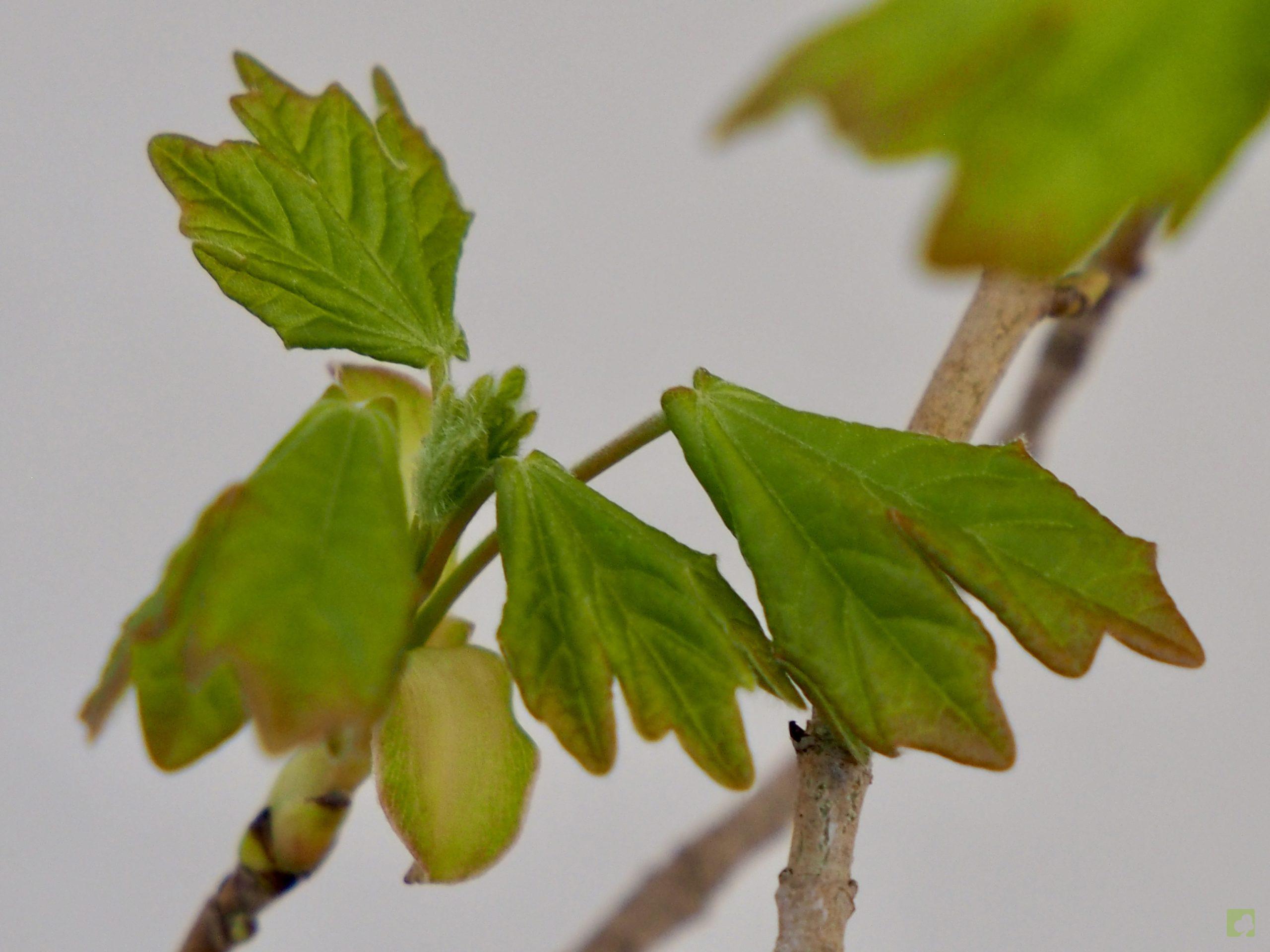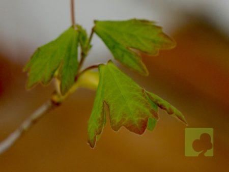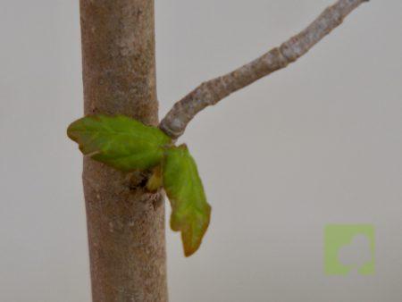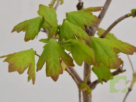 Desarrolla una copa redondeada y ancha; de hecho, los ejemplares más ‘viejos’ y los que crecen sin ningún árbol que les moleste pueden llegar a tener una que mida entre 4 y 5 metros. Las hojas son palmatilobadas, y miden unos 10 x 10 centímetros. Son de color verde-glauco, excepto en otoño que se vuelven amarillas o rojizas, y tienen el envés algo tomentoso.
