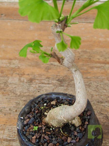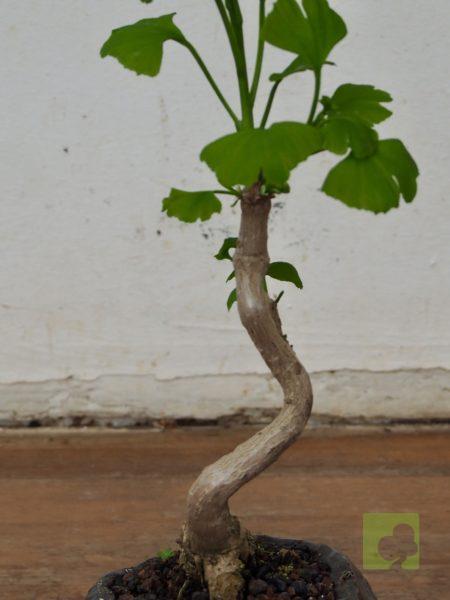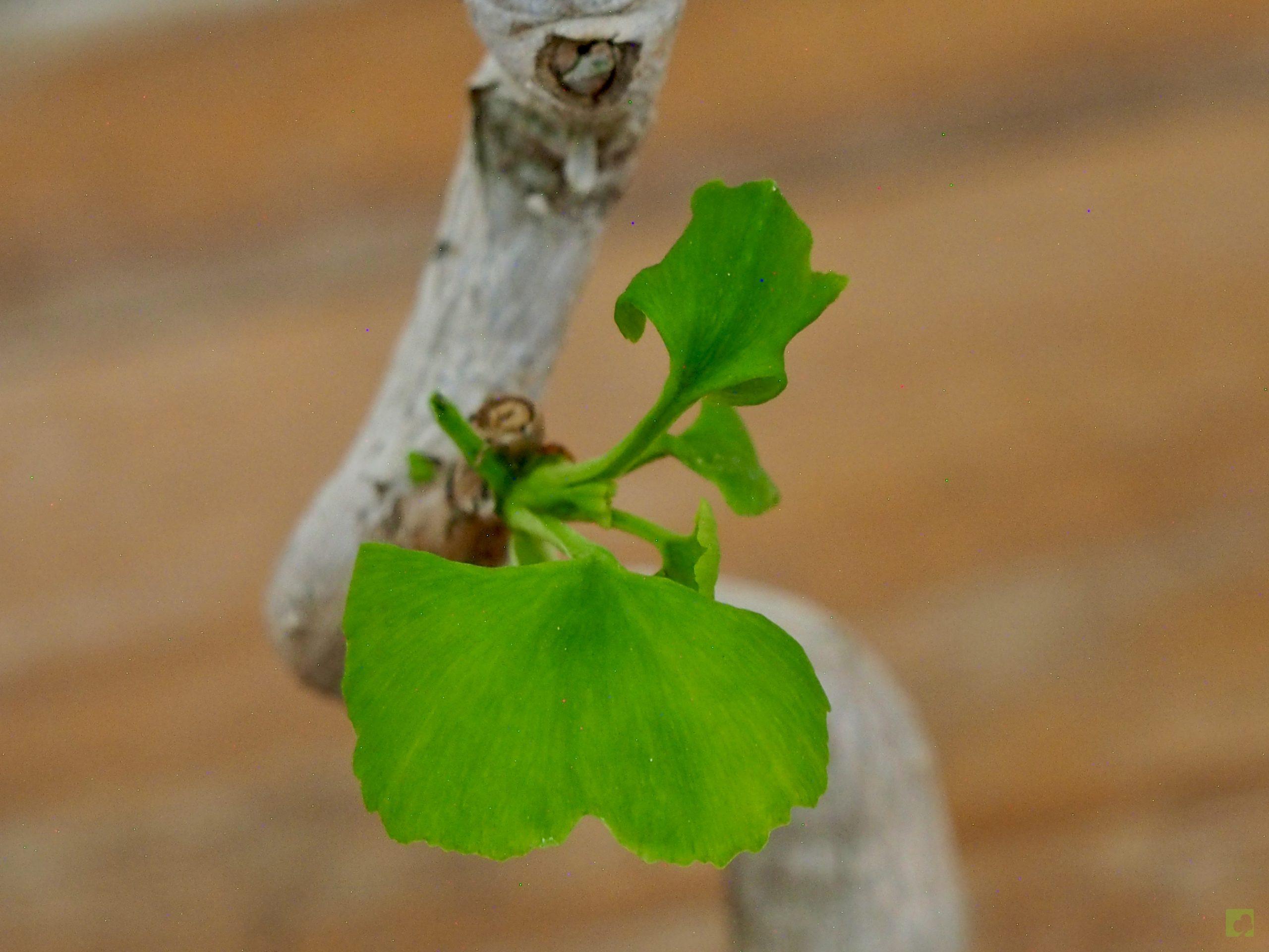 Las hojas, de color verde claro y de entre 5-15 cm, estas son planas en forma de abanico con nervadura dicotómica; las nacidas en los brotes largos suelen presentar muescas o lóbulos.