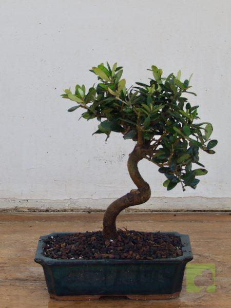 – Origen: Región Mediterránea. Actualmente se piensa que su verdadero origen puede encontrarse en Asia, concretamente en la región del Cáucaso. Debido a su vigor, resistencia, la belleza de su madera seca y la diversidad de sus formas le han hecho un clásico entre los bonsáis al olivo, siendo una de las especies más cultivadas. Crecimiento lento, pero constante. Tronco grueso que en los ejemplares viejos se retuerce y encorva de forma que alcanza tortuosidades que dejan ver que puede alcanzar el millar de años. Hojas perennes, pequeñas, alargadas y coriáceas de color verde grisáceo. Flores de color blanco. Frutos verdes o negros (las aceitunas) que oscurecen al madurar. De sus frutos se extrae el apreciado aceite de oliva. El Acebuche es una variedad silvestre del olivo, de nombre científico Olea europaea var. sylvestris. Es un arbusto algo espinoso normalmente con una altura no demasiado elevada. Sus principales diferencias con el olivo tradicional son la presencia de espinas, desaparecidas en su pariente mayor, y el reducido tamaño de sus hojas que lo convierten en una variedad especialmente apta para el cultivo como bonsái.