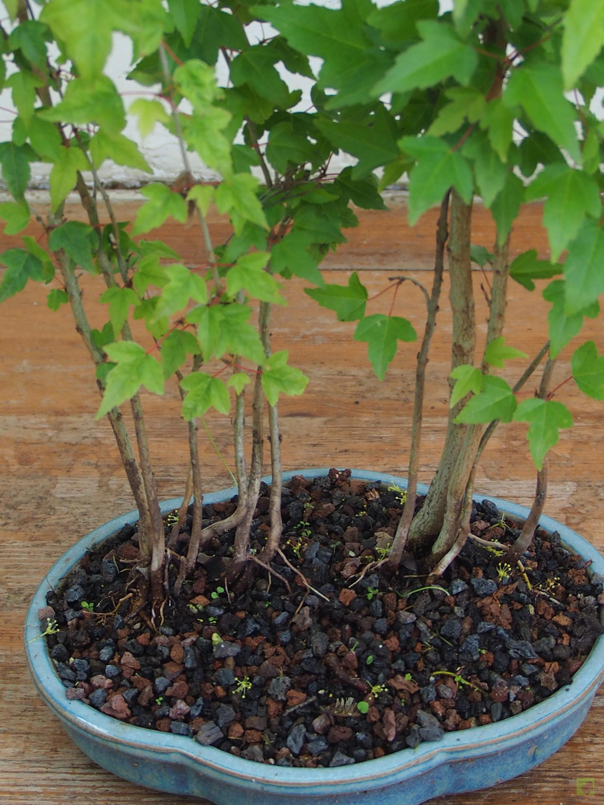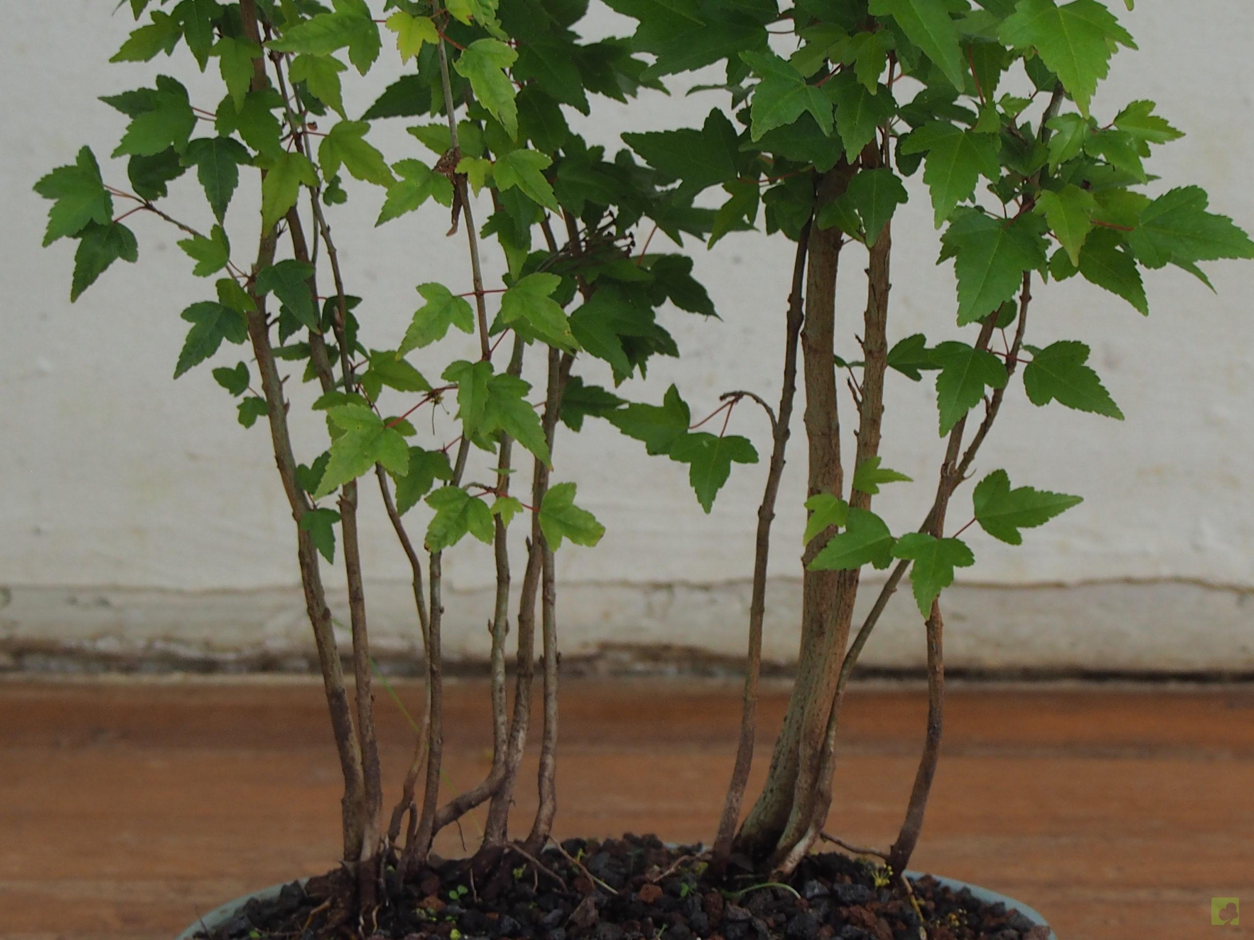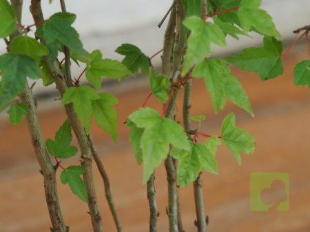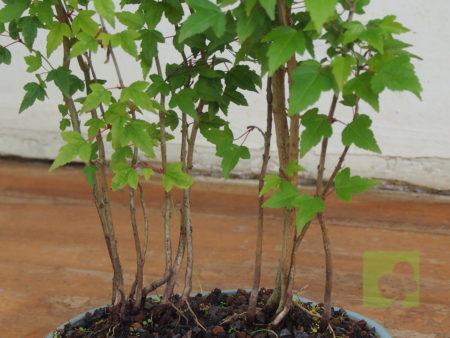– Poda: Debido a que las yemas son opuestas, los brotes serán dobles y, por tanto, debemos fijarnos en la dirección que nos interesa para la nueva rama y eliminar el brote no deseado. Esta técnica nos permitirá un aumento de ramificación en la dirección elegida. Las ramas, al igual que el tronco, son robustas por lo que siempre debemos eliminar las ramas toscas y gruesas, dejando las más finas. Este es un proceso continuo que debemos repetir estación a estación ya que es el modo de lograr una ramificación fina y delicada. En el segundo año, también en invierno, deben podarse las ramas que nazcan directamente del tronco y afeen la silueta del árbol, utilizando una buena pasta selladora. Crece rápido y obliga a un despunte frecuente, de 2 yemas. Hacer 3 ó 4 despuntes en el transcurso del verano. Esto permite obtener unos arbolitos bien tupidos. Es muy peligroso para la vida del arce podar ramas gruesas fuera del invierno. En verano puede realizarse el defoliado total o parcial sin demasiados problemas, siempre que no se lleve a cabo demasiado tarde dentro de la estación. Por otra parte, es necesario, al principio, dejar que las ramas bajas crezcan libremente para que así engorden y lograr un crecimiento adecuado de esta zona baja.