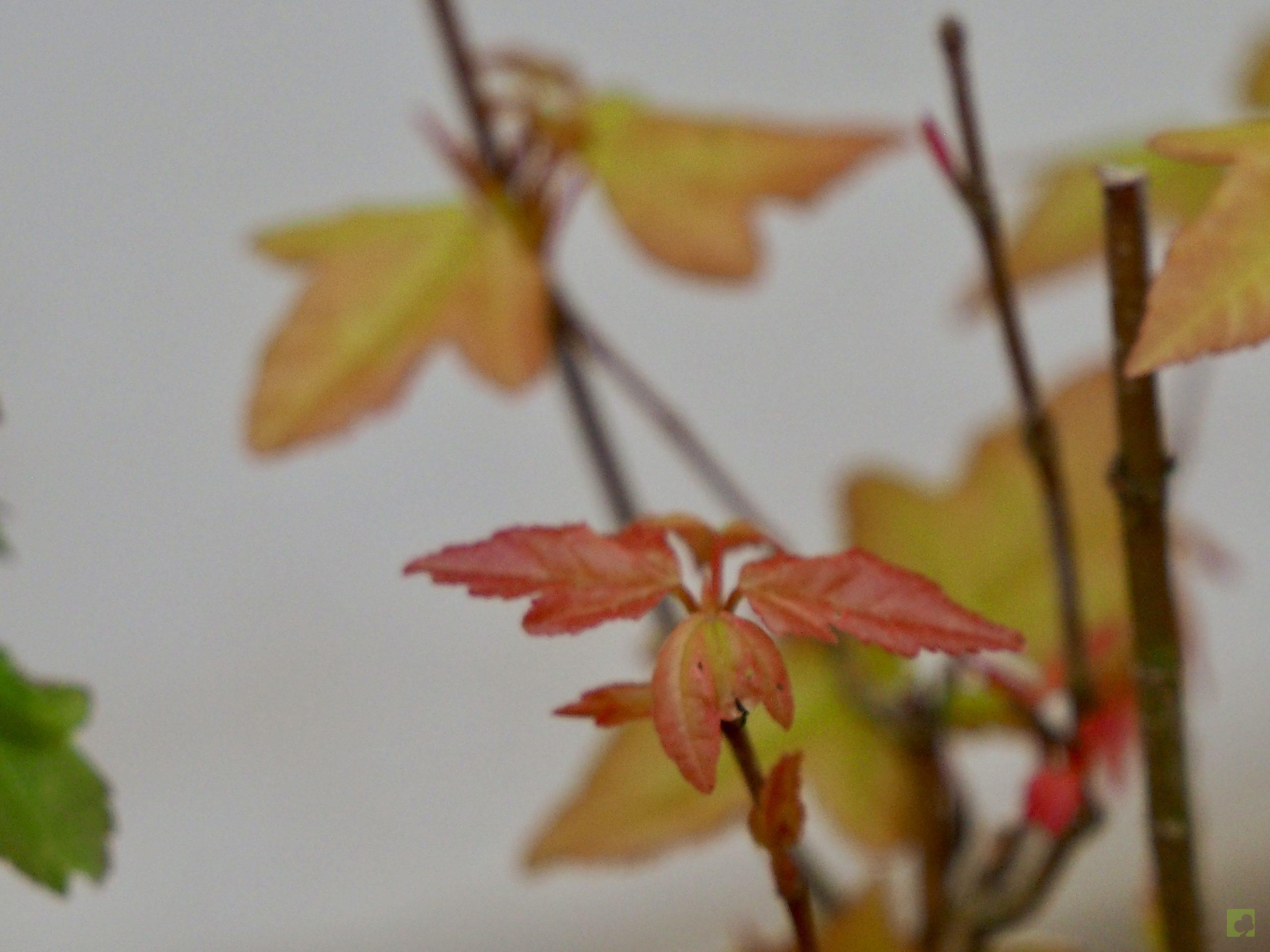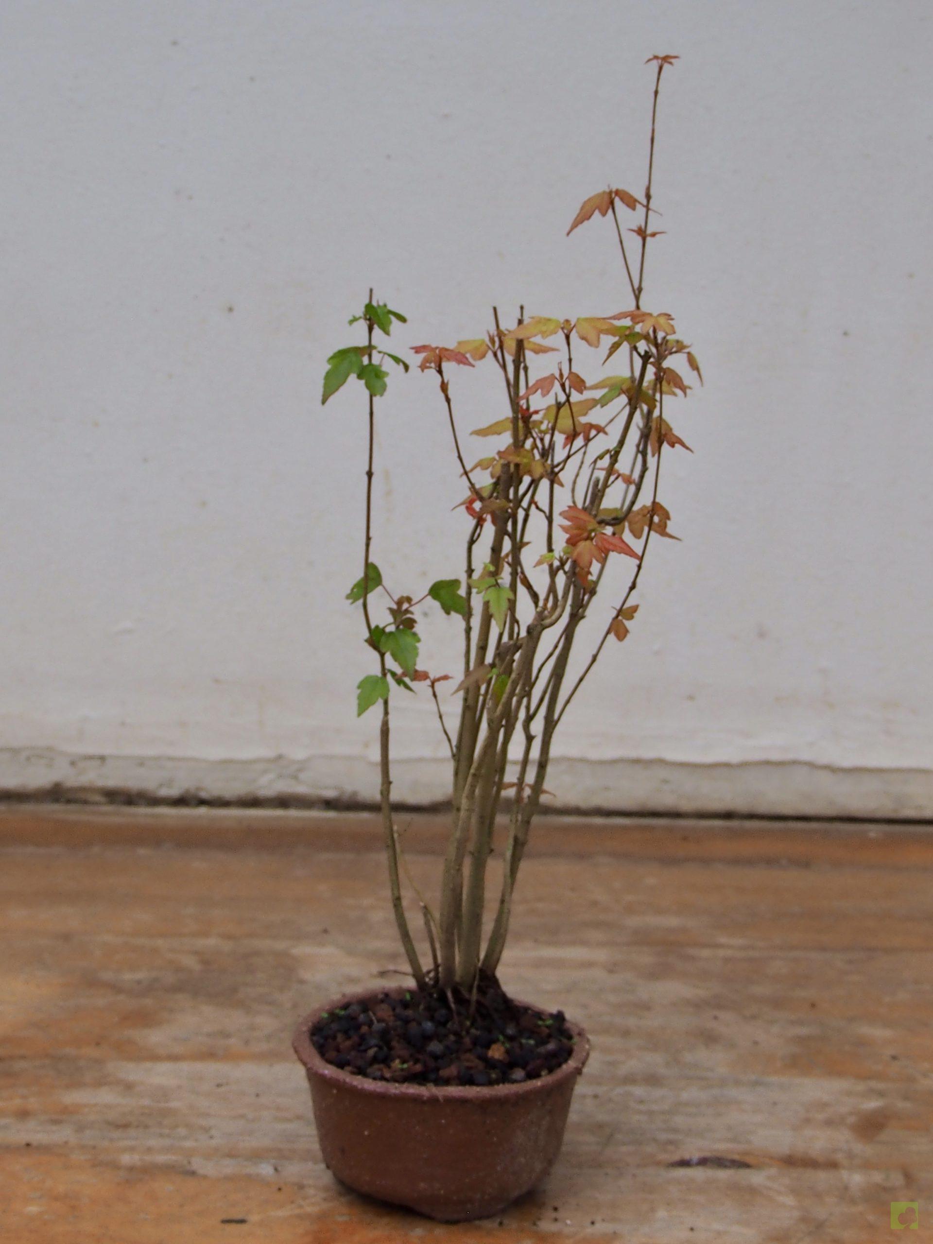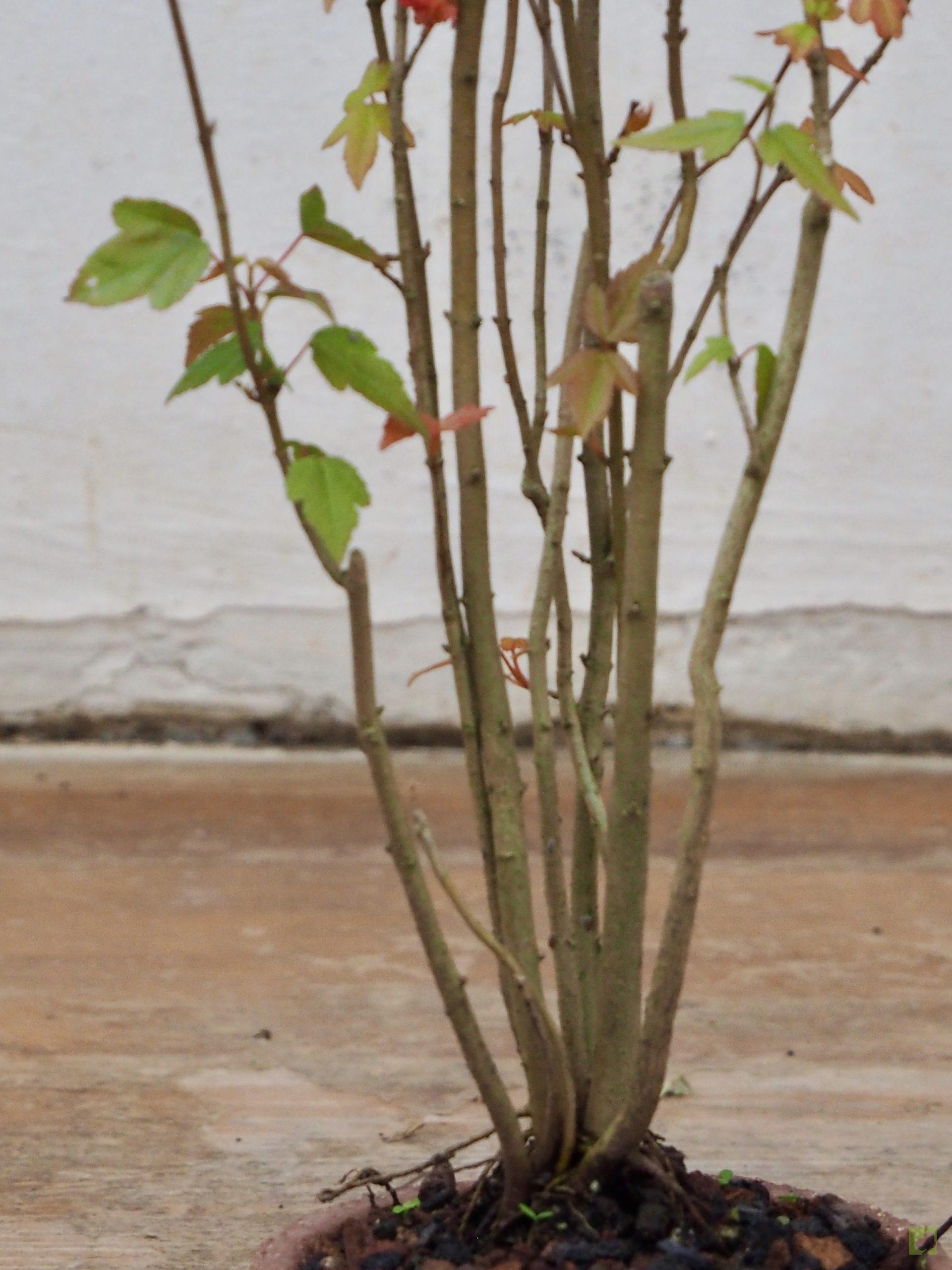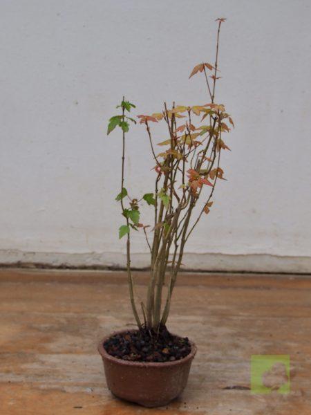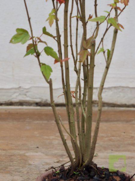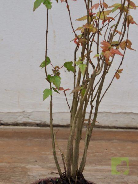 – Poda: Debido a que las yemas son opuestas, los brotes serán dobles y, por tanto, debemos fijarnos en la dirección que nos interesa para la nueva rama y eliminar el brote no deseado. Esta técnica nos permitirá un aumento de ramificación en la dirección elegida. Las ramas, al igual que el tronco, son robustas por lo que siempre debemos eliminar las ramas toscas y gruesas, dejando las más finas. Este es un proceso continuo que debemos repetir estación a estación ya que es el modo de lograr una ramificación fina y delicada. En el segundo año, también en invierno, deben podarse las ramas que nazcan directamente del tronco y afeen la silueta del árbol, utilizando una buena pasta selladora. Crece rápido y obliga a un despunte frecuente, de 2 yemas. Hacer 3 ó 4 despuntes en el transcurso del verano. Esto permite obtener unos arbolitos bien tupidos. Es muy peligroso para la vida del arce podar ramas gruesas fuera del invierno. En verano puede realizarse el defoliado total o parcial sin demasiados problemas, siempre que no se lleve a cabo demasiado tarde dentro de la estación. Por otra parte, es necesario, al principio, dejar que las ramas bajas crezcan libremente para que así engorden y lograr un crecimiento adecuado de esta zona baja.