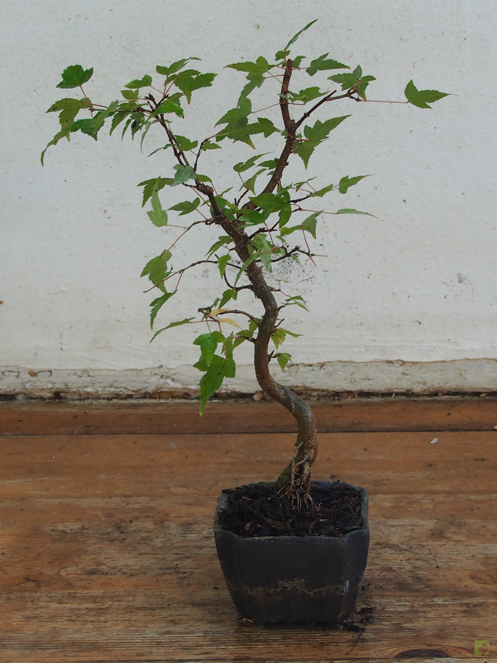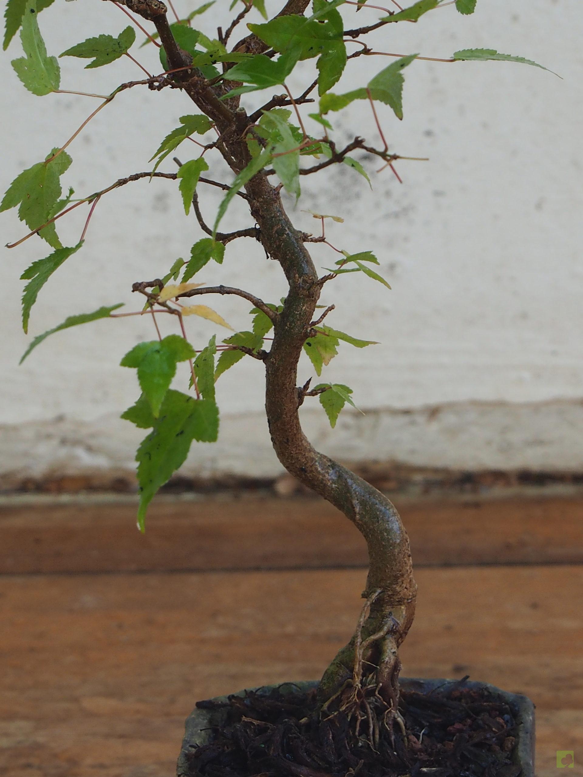– Poda: Debido a que las yemas son opuestas, los brotes serán dobles y, por tanto, debemos fijarnos en la dirección que nos interesa para la nueva rama y eliminar el brote no deseado. Esta técnica nos permitirá un aumento de ramificación en la dirección elegida. Las ramas, al igual que el tronco, son robustas por lo que siempre debemos eliminar las ramas toscas y gruesas, dejando las más finas. Este es un proceso continuo que debemos repetir estación a estación ya que es el modo de lograr una ramificación fina y delicada. En el segundo año, también en invierno, deben podarse las ramas que nazcan directamente del tronco y afeen la silueta del árbol, utilizando una buena pasta selladora. Crece rápido y obliga a un despunte frecuente, de 2 yemas. Hacer 3 ó 4 despuntes en el transcurso del verano. Esto permite obtener unos arbolitos bien tupidos. Es muy peligroso para la vida del arce podar ramas gruesas fuera del invierno. En verano puede realizarse el defoliado total o parcial sin demasiados problemas, siempre que no se lleve a cabo demasiado tarde dentro de la estación. Por otra parte, es necesario, al principio, dejar que las ramas bajas crezcan libremente para que así engorden y lograr un crecimiento adecuado de esta zona baja.