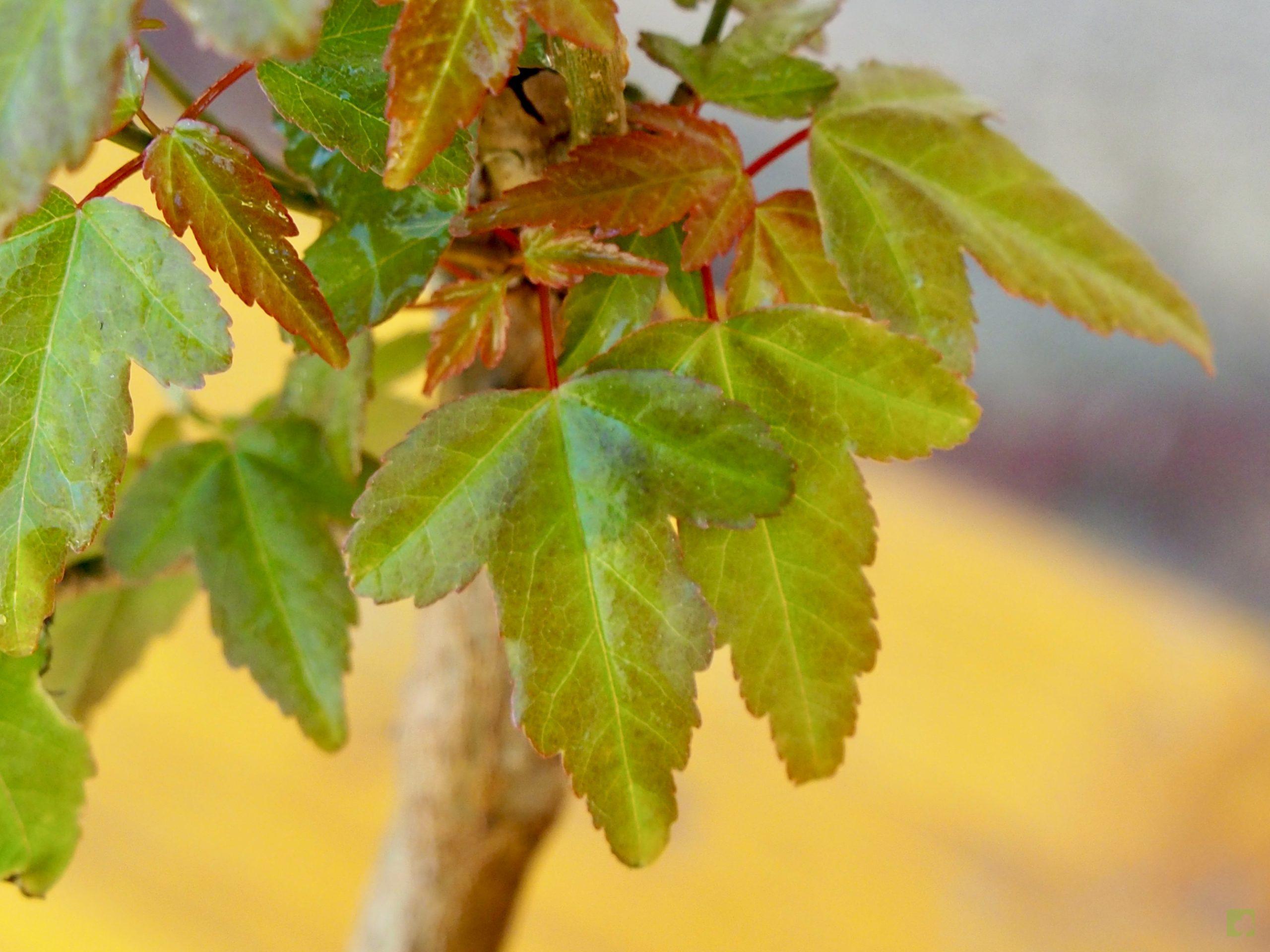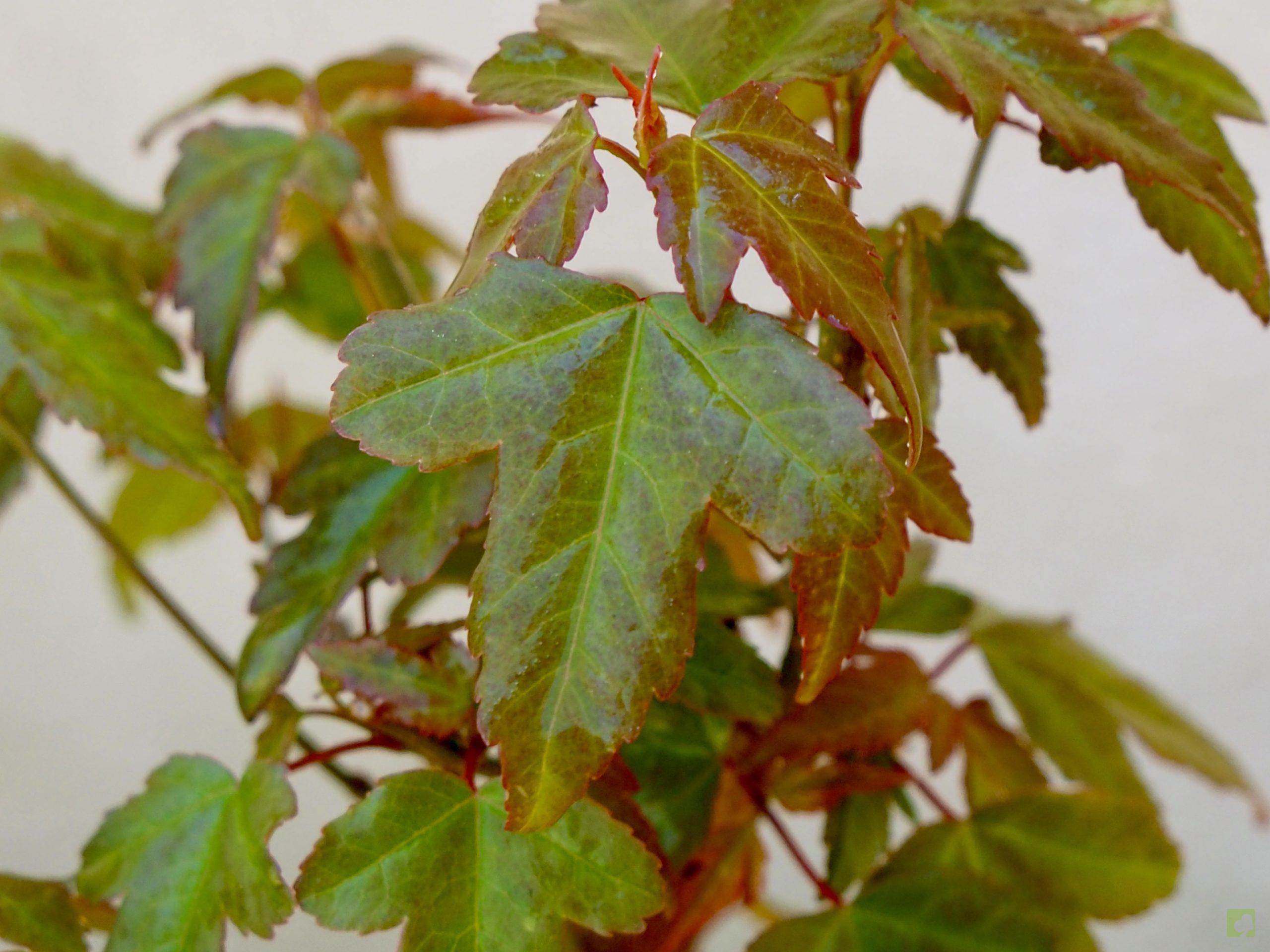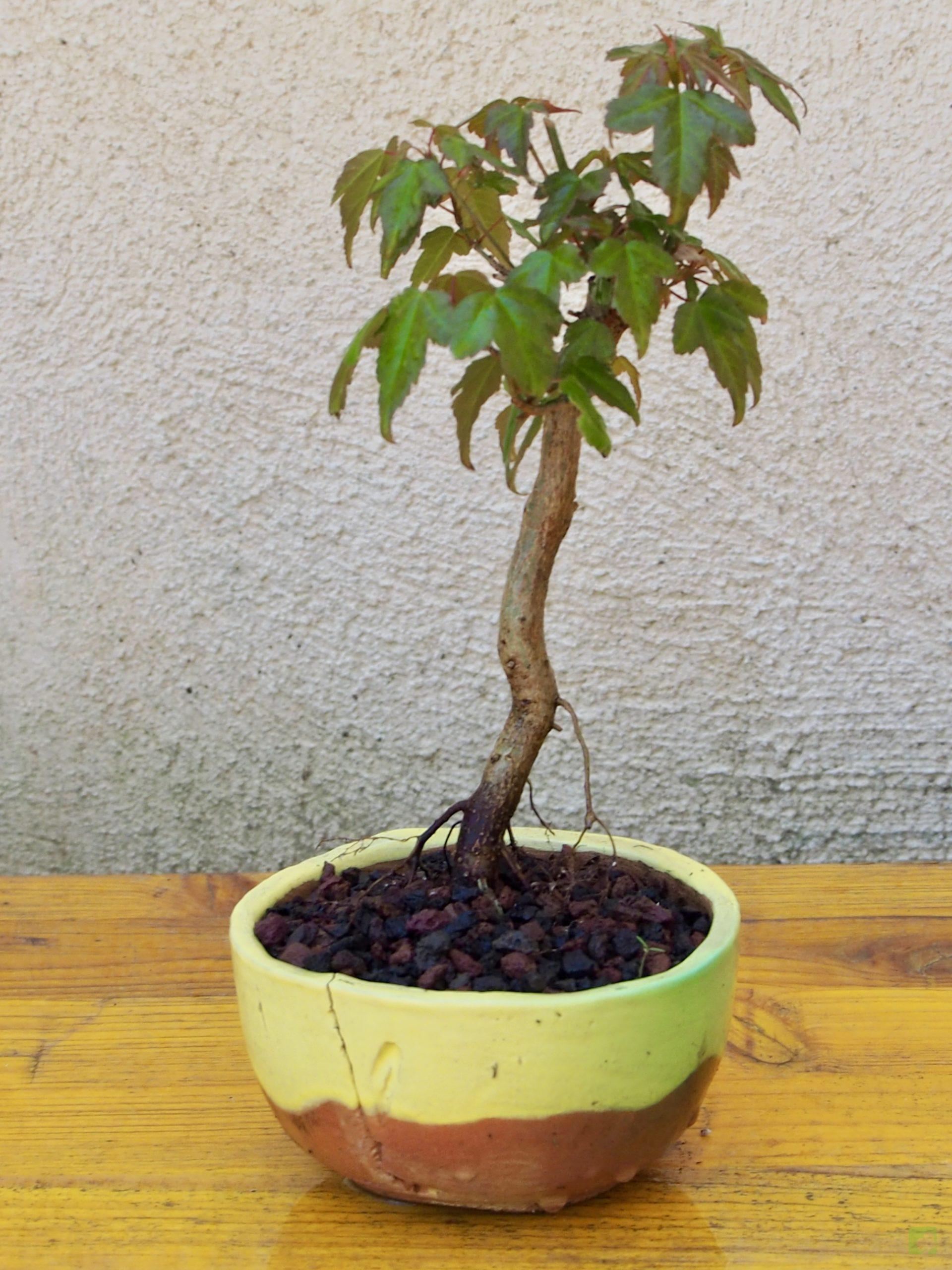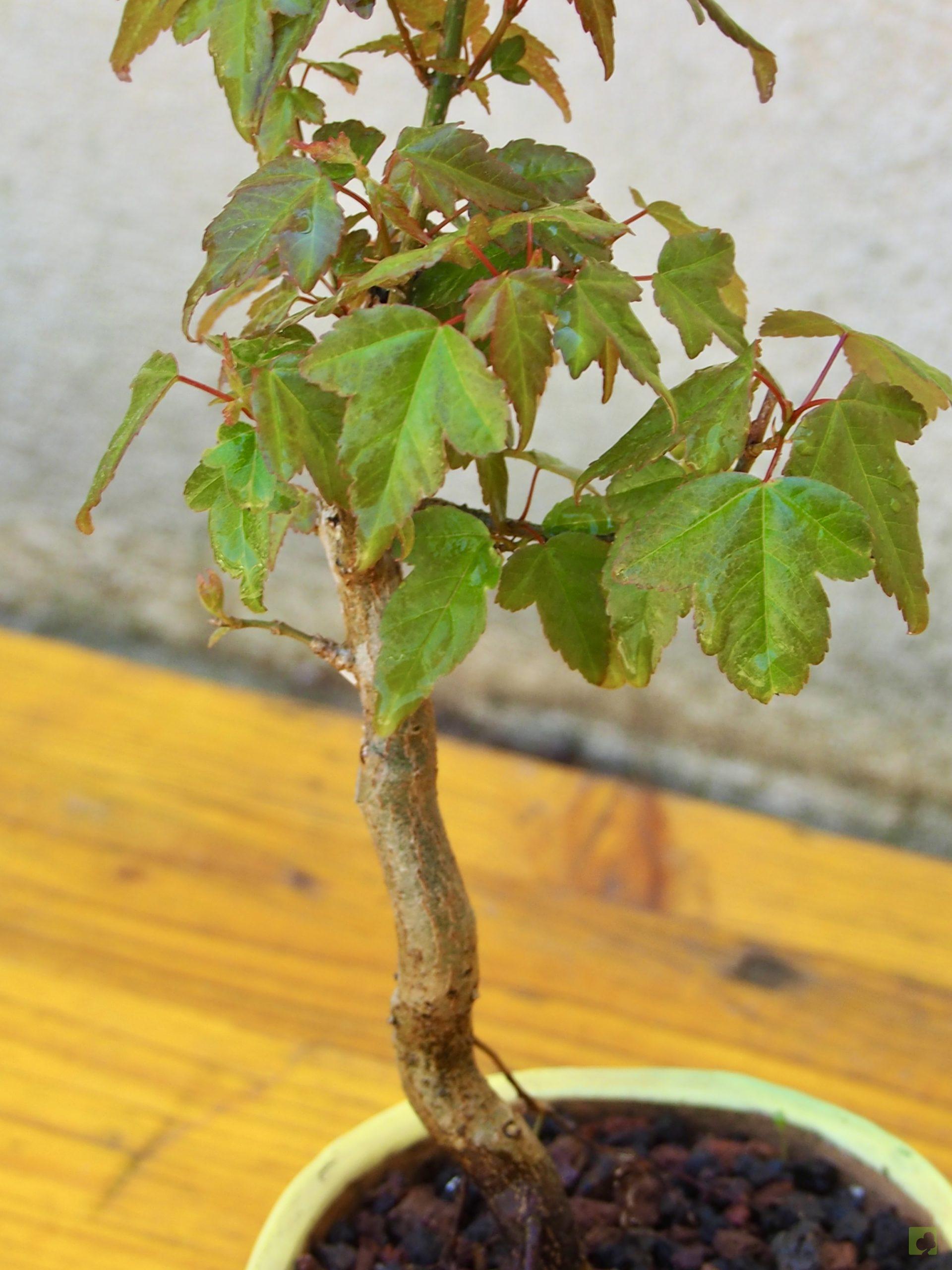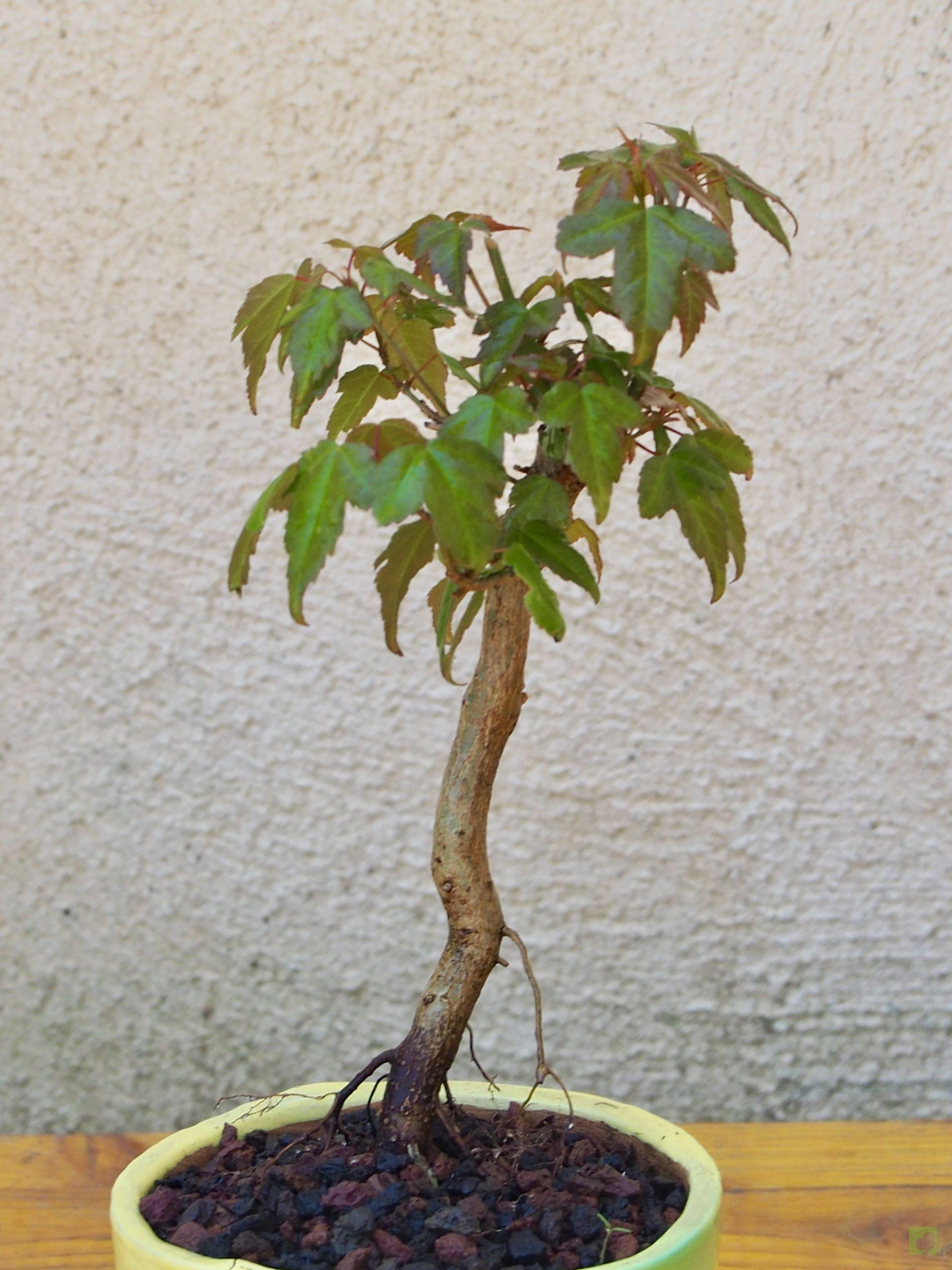 – Poda: Debido a que las yemas son opuestas, los brotes serán dobles y, por tanto, debemos fijarnos en la dirección que nos interesa para la nueva rama y eliminar el brote no deseado. Esta técnica nos permitirá un aumento de ramificación en la dirección elegida. Las ramas, al igual que el tronco, son robustas por lo que siempre debemos eliminar las ramas toscas y gruesas, dejando las más finas. Este es un proceso continuo que debemos repetir estación a estación ya que es el modo de lograr una ramificación fina y delicada. En el segundo año, también en invierno, deben podarse las ramas que nazcan directamente del tronco y afeen la silueta del árbol, utilizando una buena pasta selladora. Crece rápido y obliga a un despunte frecuente, de 2 yemas. Hacer 3 ó 4 despuntes en el transcurso del verano. Esto permite obtener unos arbolitos bien tupidos. Es muy peligroso para la vida del arce podar ramas gruesas fuera del invierno. En verano puede realizarse el defoliado total o parcial sin demasiados problemas, siempre que no se lleve a cabo demasiado tarde dentro de la estación. Por otra parte, es necesario, al principio, dejar que las ramas bajas crezcan libremente para que así engorden y lograr un crecimiento adecuado de esta zona baja.