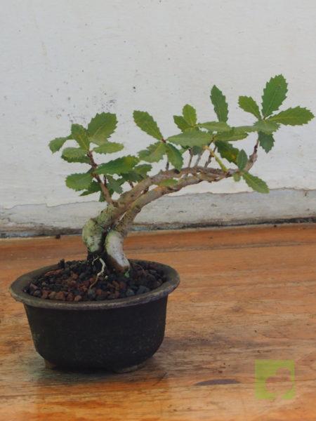 – Poda: El final del invierno y al trasplantar, son los períodos más adecuados para la poda. La poda de estructura es mejor realizarla antes del inicio del periodo vegetativo, es decir, justo antes de brotar. Al final del invierno empieza ya a verse los brotes. Cuando estos tengan aproximadamente 8 pares de hojas debemos cortar, dejando sólo 2 ó 4 pares de hojas. En un lugar adecuado y pinzando (cortar las puntas) frecuentemente puede llegar a cuatro o cinco brotes en el año. Esto nos permite reducir la hoja considerablemente y además evitar plagas. – Eliminar los brotes no deseados que aparecen en la base del tronco o bien alrededor de las cicatrices de las ramas podadas. Acepta las defoliaciones anuales, algo que puede ser útil teniendo en cuenta el tamaño de sus hojas. Cuando las yemas ya están hinchadas se puede defoliar, si bien todos los años pueden realizarse esta práctica, con un buen pinzado no es preciso defoliar cada año. Conviene así mismo dejar un trozo del peciolo. Debemos sellar siempre las heridas para una mejor cicatrización y evitar plagas y enfermedades convenientes realizar la poda de formación con el árbol en tierra, pues en maceta se ralentiza mucho su crecimiento.