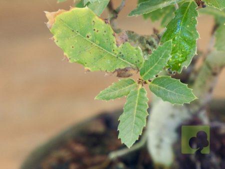 – Enfermedades: Oídio (síntomas de polvo blanco harinoso). Es un hongo que aparece en ambientes poco ventilados, húmedos y sombríos. Se debe poner el árbol al sol, no regar en exceso ni pulverizar, eliminar las hojas infectadas y aplicar un fungicida adecuado anti oídio, por ejemplo, azufre. Se puede prevenir el Odio con rociadas preventivas antes de que los árboles broten si se da este patógeno con frecuencia. Otras enfermedades son los Chancros, Agallas del roble y el Mildiu.