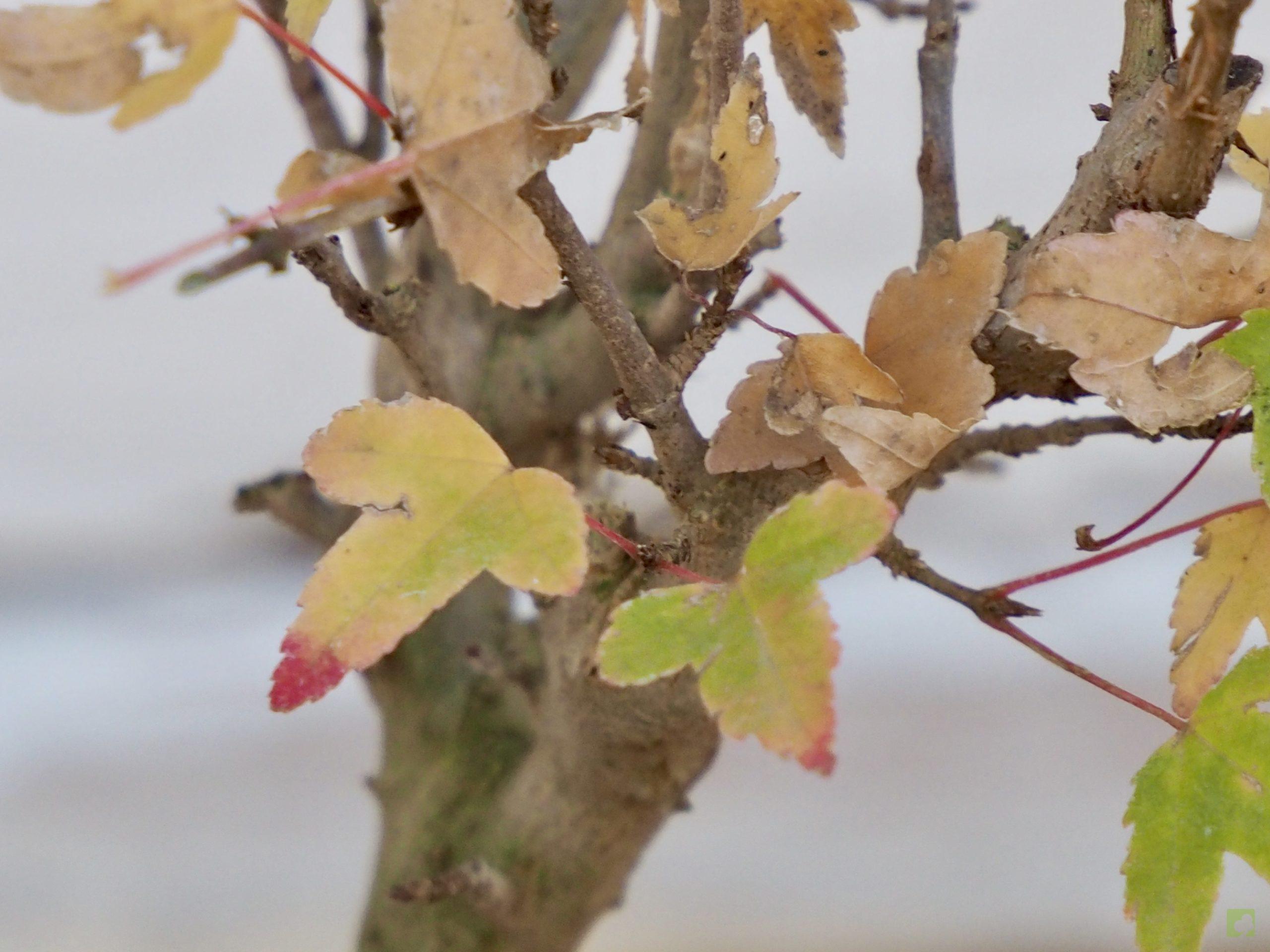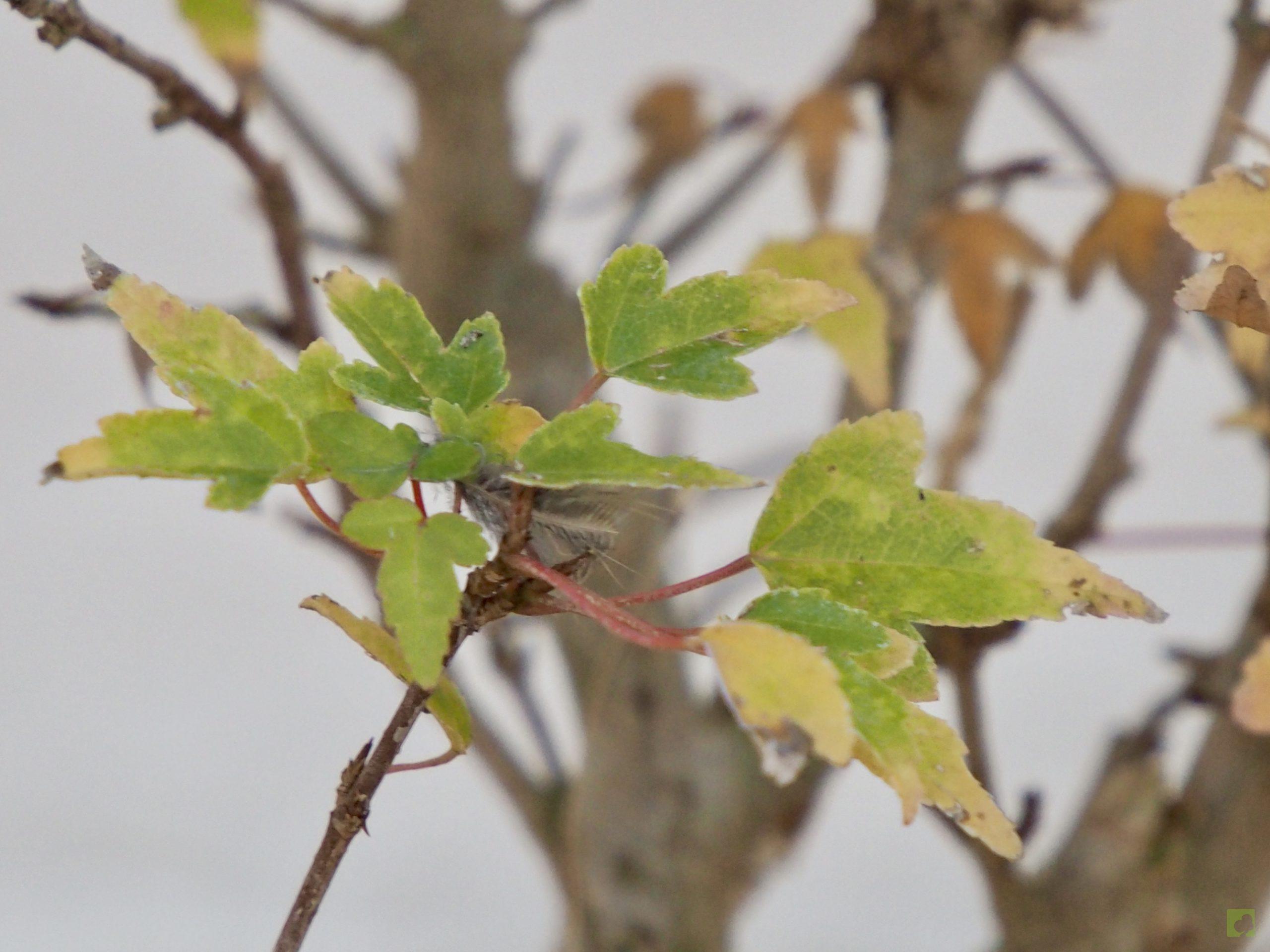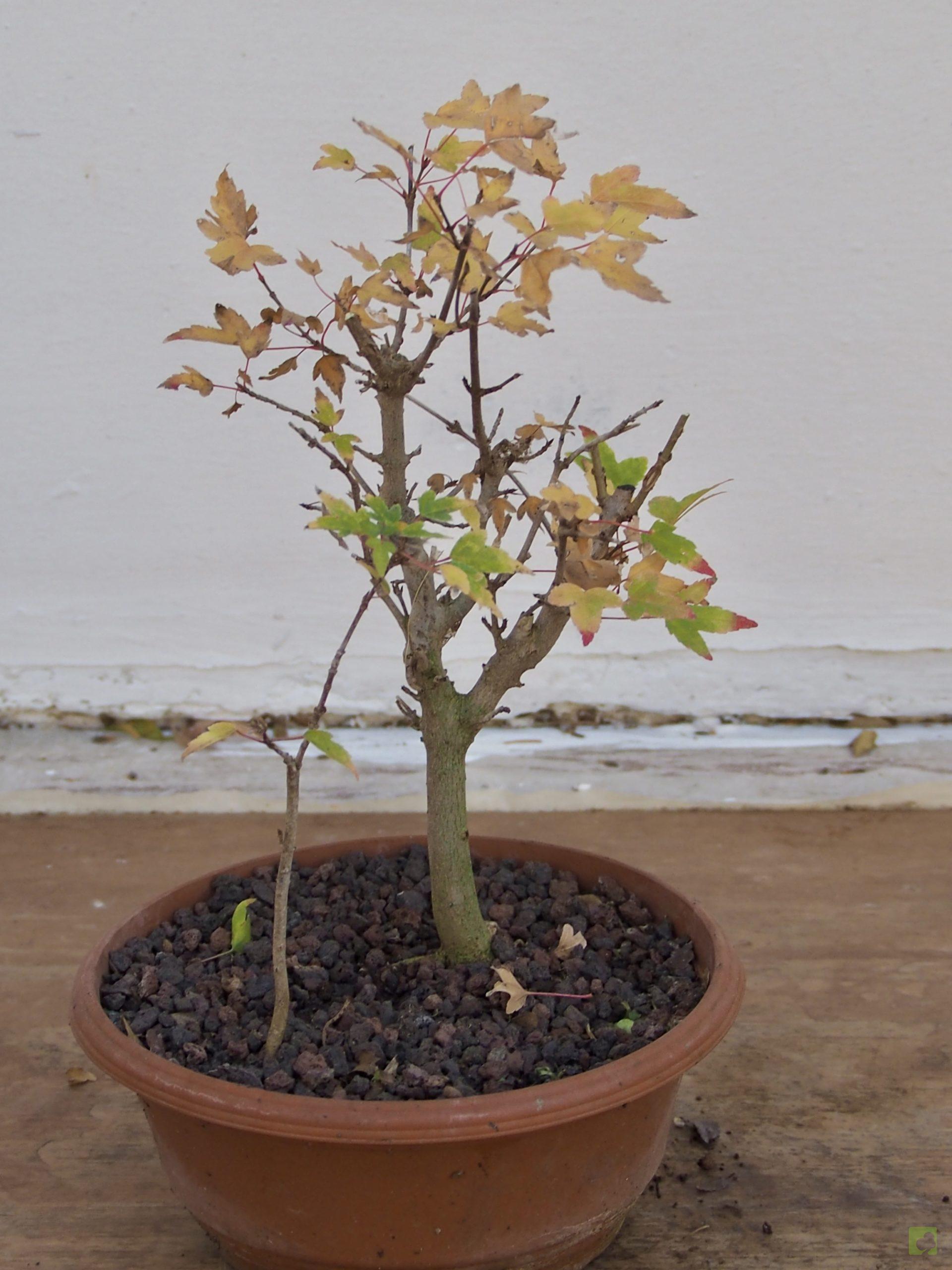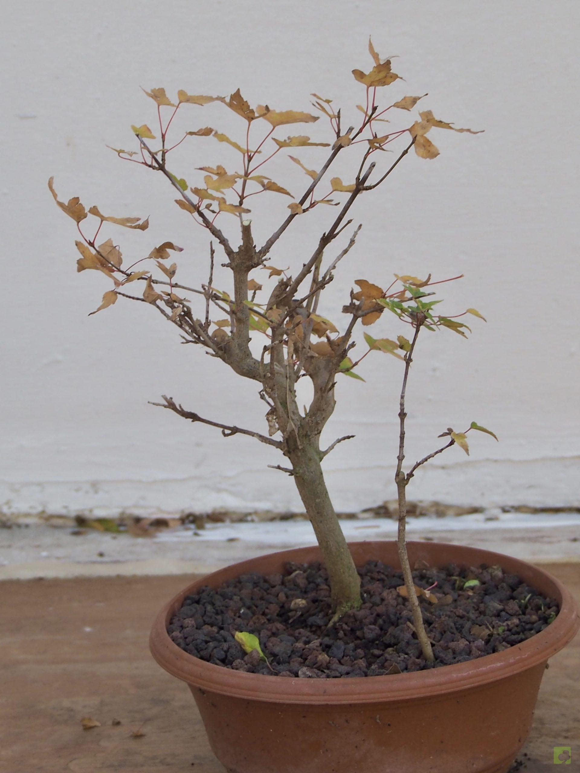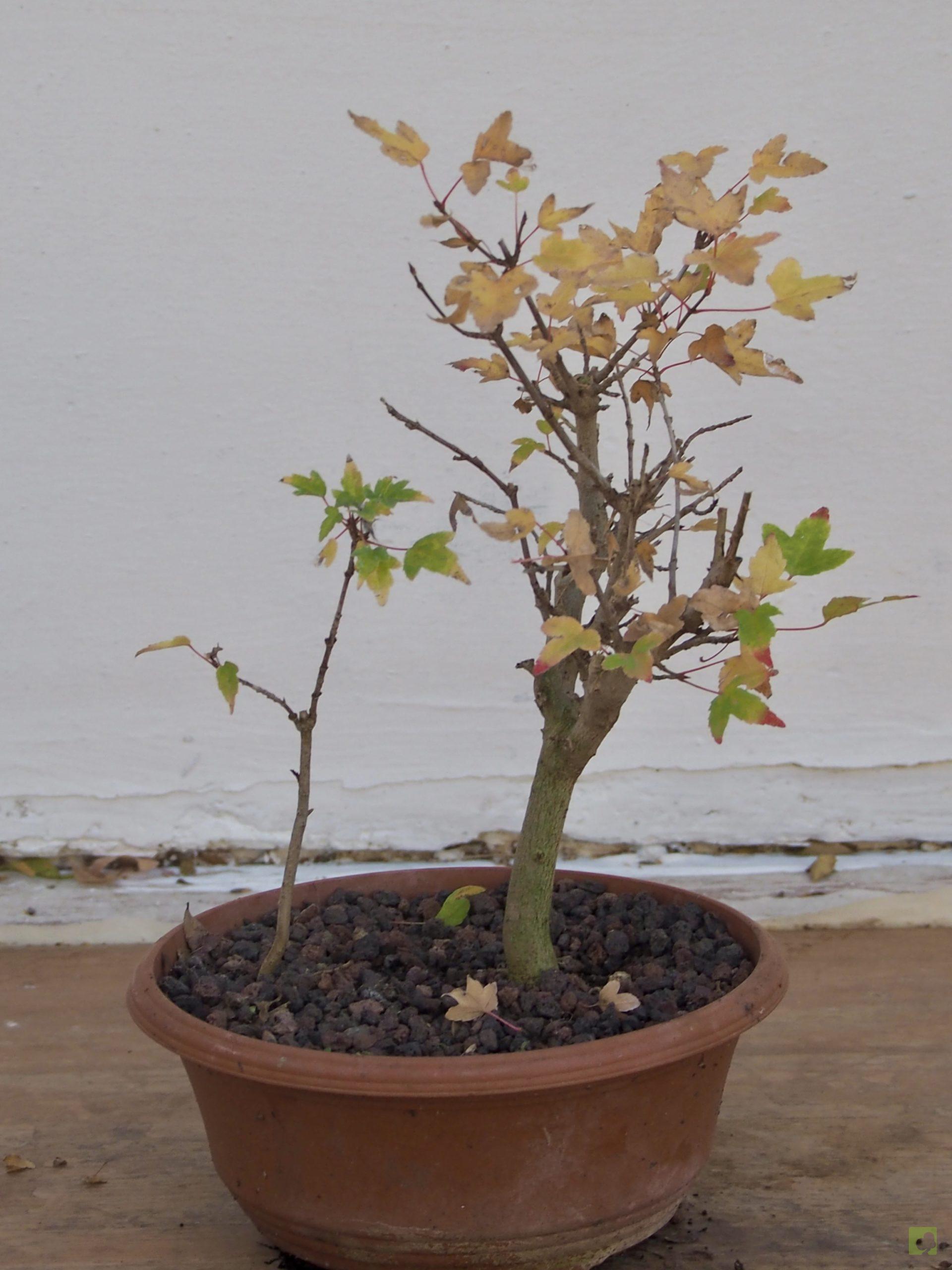 – Poda: Debido a que las yemas son opuestas, los brotes serán dobles y, por tanto, debemos fijarnos en la dirección que nos interesa para la nueva rama y eliminar el brote no deseado. Esta técnica nos permitirá un aumento de ramificación en la dirección elegida. Las ramas, al igual que el tronco, son robustas por lo que siempre debemos eliminar las ramas toscas y gruesas, dejando las más finas. Este es un proceso continuo que debemos repetir estación a estación ya que es el modo de lograr una ramificación fina y delicada. En el segundo año, también en invierno, deben podarse las ramas que nazcan directamente del tronco y afeen la silueta del árbol, utilizando una buena pasta selladora. Crece rápido y obliga a un despunte frecuente, de 2 yemas. Hacer 3 ó 4 despuntes en el transcurso del verano. Esto permite obtener unos arbolitos bien tupidos. Es muy peligroso para la vida del arce podar ramas gruesas fuera del invierno. En verano puede realizarse el defoliado total o parcial sin demasiados problemas, siempre que no se lleve a cabo demasiado tarde dentro de la estación. Por otra parte, es necesario, al principio, dejar que las ramas bajas crezcan libremente para que así engorden y lograr un crecimiento adecuado de esta zona baja.