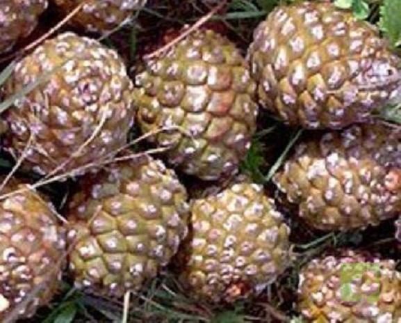Fructificación: piña globoso-ovoidea de 8 a 15 cm x 7 a 10 cm, subsésil, caduca, brillante, apófisis convexas.